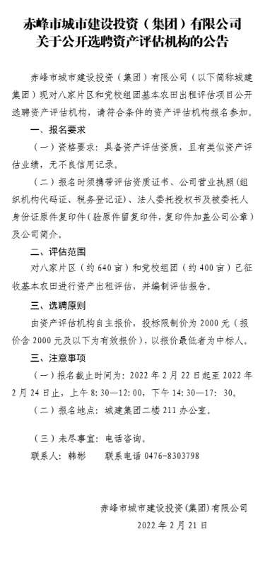 下一篇:赤峰市城市建設(shè)投資(集團(tuán))有限公司 關(guān)于公開(kāi)選聘資產(chǎn)評(píng)估機(jī)構(gòu)的公告