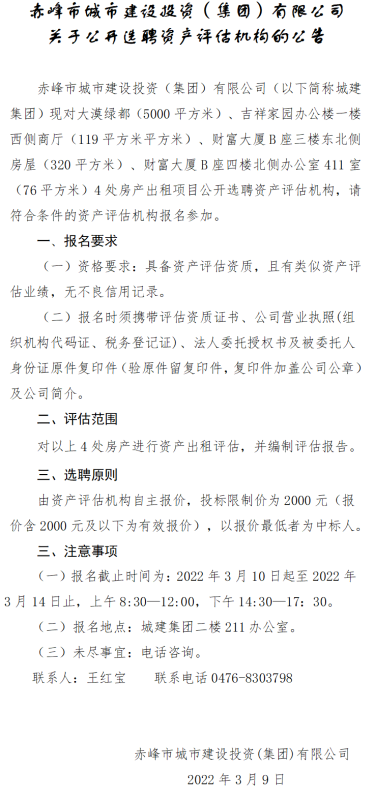 赤峰市城市建設投資(集團)有限公司 關于公開選聘資產評估機構的公告