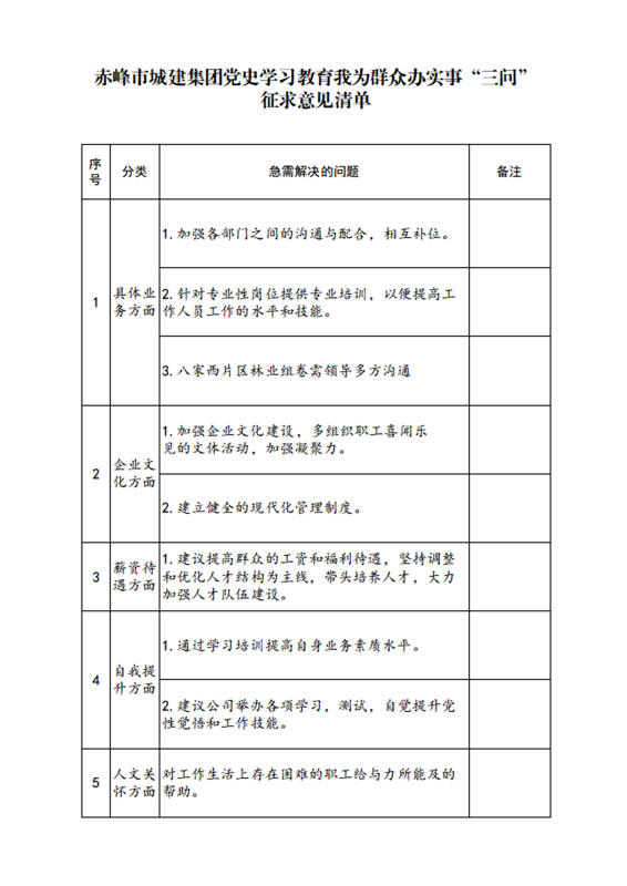 赤峰市城建集團黨史學(xué)習(xí)教育我為群眾辦實事“三問” 征求意見清單